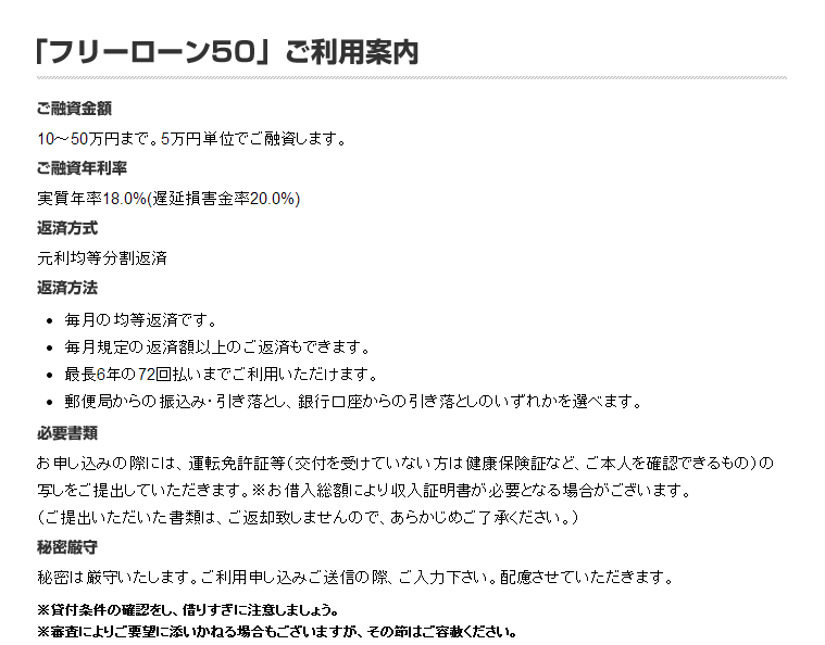 「フリーローン50」のご融資金額は10万円以上から5万円単位で最高50万円までご利用いただけます。